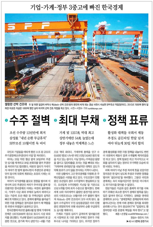 동아일보는 두 달 뒤면 일감이 바닥나 독(dock.선박 건조대)이 완전히 비게 되는 경남 사천시 사남면 SPP조선 작업장의 모습을 담았다.