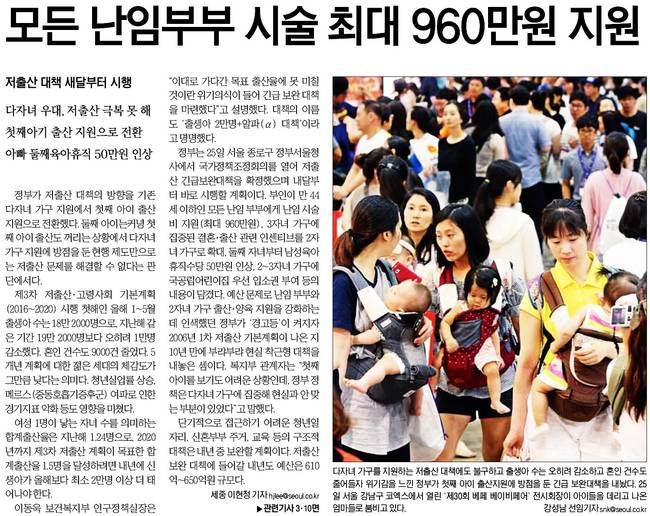 서울신문은 다자녀 가구를 지원하는 저출산 대책에도 불구하고 출생아 수는 오히려 감소하고 혼인 건수도 줄어들자 위기감을 느낀 정부가 첫째 아이 출산지원에 방점을 둔 긴급 보완대책을 내놓은 가운데 25일 서울 강남구 코엑스에서 열린 '제30회 베페 베이비페어' 전시회장이 아이들을 데리고 나온 엄마들로 붐빈 모습을 전했다.