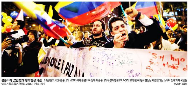 세계일보는 24일(현지시간) 콜롬비아 보고타에서 콜롬비아 정부와 콜롬비아무장혁명(FARC)이 52년 만에 평화협정을 체결했다는 소식이 전해지자 국민들이 국기를 흔들며 환호하는 장면을 실었다. 2012년 11월 쿠바 수도 아바나에서 협상을 시작한 지 3년9개월 만이다.