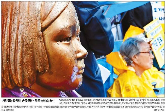 일본군성노예제문제해결을 위한 정의기억재단이 31일 서울 종로구 중학동 주한 일본대사관 앞에서 ‘12‧28한일합의 강행 규탄 기자회견’을 열었다. 한국일보는 일본군 위안부 피해자 김복동 할머니와 소녀상의 모습을 1면 사진으로 담았다.