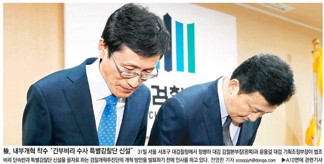 ‘제2의 진경준, 홍만표’ 비리를 예방하기 위해 검찰이 간부들의 비위를 전담 수사하는 특별감찰단을 신설하는 것을 골자로 한 강력한 대책을 내놓았다. 동아일보는 31일 서울 서초구 대검찰청에서 정병하 대검 감찰본부장과 윤웅걸 대검 기획조정부장이 검찰 개혁 방안을 발표하기 전에 인사를 하고 있는 모습을 1면 사진으로 전했다.