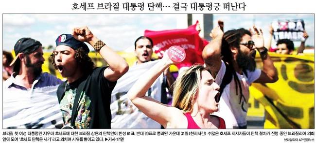 브라질 상원이 31일(현지시간) 탄핵 심판 개시 결정으로 직무가 정지된 지우마 호세프 대통령에 대한 탄핵 표결을 가결시켰다. 서울신문은 호세프 지지자들이 탄핵 절차가 진행 중인 브라질리아 의회 앞에 모여 “호세프 탄핵은 사기”라고 외치며 시위를 벌이고 있는 모습을 1면 사진으로 전했다. 서울신문은 “호세프에 대한 브라질 상원의 탄핵안이 찬성 61표, 반대 20표로 통과됐다”며 “이로써 호세프 대통령은 브라질 역사에서 탄핵으로 물러나는 두 번째 대통령으로 남게 됐다”고 보도했다.