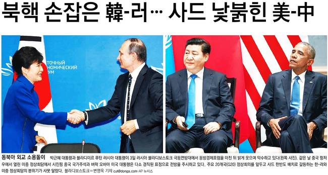중앙일보는 "3일 러시아 블라디보스토크에서 열렸던 한·러 정상회담은 한·중 정상회담의 전초전 성격이었다. 이날 회담 뒤 열린 박 대통령과 블라디미르 푸틴 러시아 대통령의 공동 기자회견에선 ‘사드’라는 단어가 나오지 않았다. 박 대통령은 “북한 문제 해결에 있어 푸틴 대통령과 전략적 소통을 더욱 강화해나가기로 했다”고 말했다"고 했다.