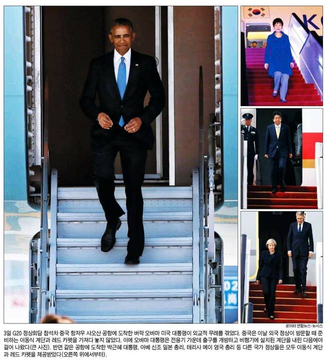 조선일보는 "오바마 대통령의 임기 중 마지막 방중(訪中)이 의전 홀대 논란에 휩싸였다. 전용기인 에어포스 원을 이용해 G20 정상회의가 열리는 중국 항저우에 도착한 오바마 대통령은 중국 측이 레드 카펫이 깔린 이동식 계단을 제공하지 않아, 전용기 가운데 출구를 열고 자체 트랩으로 내려왔다"며 "박근혜 대통령과 블라디미르 푸틴 러시아 대통령 등 이번 회의에 참석한 대부분의 다른 정상은 레드 카펫을 제공받았다"고 설명했다.