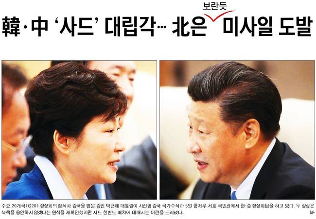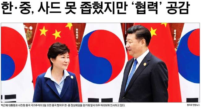 경향신문은 "시 주석이 5일 박근혜 대통령을 앞에 두고 “동북아 정세에 도움이 되지 않는다”며 고고도미사일방어체계(사드) 한반도 배치를 공개 반대했다"며 "양 정상이 양국관계의 분수령으로 여겨지던 이날 회담에서 사드 문제에 진전된 합의나 의견교환을 이루지 못한 채 ‘인식’ 차이만 확인하면서 한·중관계를 포함한 동북아 긴장국면도 심화할 것으로 전망된다. 북핵에 대한 중국의 공조를 유지하는 데도 부정적 영향을 줄 것으로 보인다"고 보도했다.