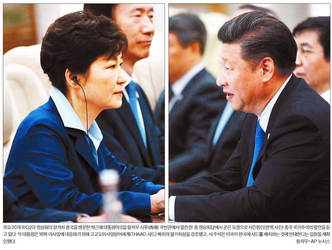 시진핑 중국 국가주석이 5일 중국 항저우에서 박근혜 대통령과 만나 한반도 사드(THAAD·한반도 고고도미사일방어체계) 배치 반대의사를 거듭 밝히면서 한중간 입장차를 재확인했다.