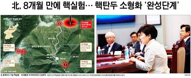 북한이 정권수립일인 9일 5차 핵실험을 강행했다. 4차 핵실험이 이후 8개월여 만이다. 라오스를 순방 중이던 박근혜 대통령은 이날 조기 귀국해 안보상황 점검회의를 개최하고 "권력 유지를 위해 국제 사회와 주변국의 어떠한 이야기도 듣지 않겠다는 김정은의 정신 상태는 통제 불능이라고 봐야 할 것"이라고 밝혔다.