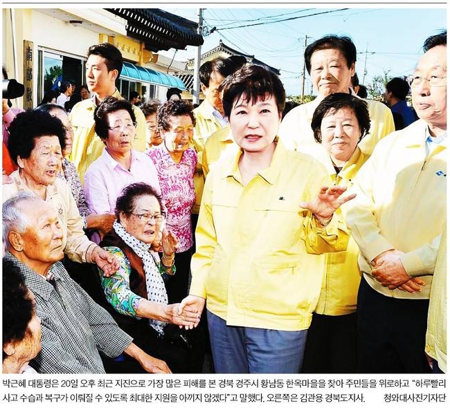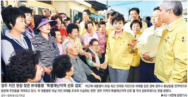 박근혜 대통령이 20일 오후 경북 경주 지진 현장과 월성 원자력발전소를 잇따라 방문했다. 박 대통령은 이날 지진피해를 입은 경북 경주시를 특별재난지역으로 선포하는 것을 검토하라고 지시했다. 21일 상당수 주요 일간지들은 지진피해 지역을 방문한 박근혜 대통령의 모습을 신문 1면 사진으로 선택했다.