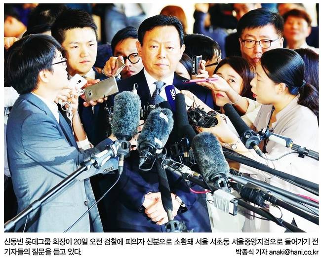 한겨레신문 역시 같은 사진을 사용했다. 한겨레는 관련기사에서 “1967년 롯데그룹 창사 이래 총수가 피의자로 검찰에 출석한 건 처음”이라며 “이날 오전 9시20분께 서울 중앙지검 청사에 도착한 신 회장은 ‘심려를 끼쳐드려 죄송하다. 검찰 수사에 성실히 협조하겠다’는 짧은 말을 남기고 조사실로 들어갔다”고 보도했다.