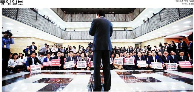 국정감사 파행 나흘째, 새누리당이 국감 참여를 놓고 둘로 쪼개졌다. 30일 경향신문과 세계일보 중앙일보는 둘로 나눠진 여당의 모습을 1면 사진에 담았다.