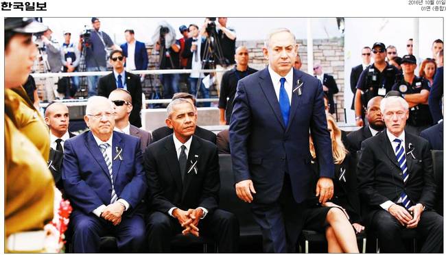 한국일보는 시몬 페레스 이스라엘 전 대통령의 장례식 장면을 1면으로 보도했다. 한국에 따르면 이날 미국 버락 오바마 대통령과 빌 클린턴 전 대통령을 비롯해 전세계 80여개국 전현직 정상들이 참석했다. 박 대통령은 홍문종 새누리당 의원을 단장으로 한 조문단을 보냈다.