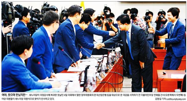 경향신문은 5일자 1면 사진기사로 새누리당이 국정감사에 복귀한 첫날인 4일 국회에서 열린 정무위원회의 한국산업은행 등을 대상으로 한 국감을 시작하기 전 더불어민주당 전해철 간사 등 야당 의원들이 새누리당 의원석으로 찾아가 인사하고 있는 장면을 실었다.