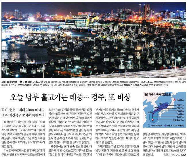 동아일보는 "제18호 태풍 '차바'가 5일 새벽 제주도를 관통해 부산 앞바다까지 이동할 것으로 예보돼 비, 강풍 피해가 우려된다"고 전했다.