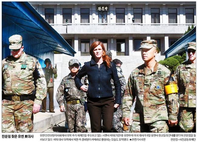 방한 중인 서맨사 파워 유엔주재 미국대사가 9일 “미국은 북한을 압박하고자 모든 도구를 사용할 의지가 있다”고 밝혔다. 지난 3월 채택된 유엔 안전보장이사회(안보리) 결의 2270호의 일부 예외조항이 악용되고 있다면서 이를 보완하겠다고도 했다. 이날 다수의 주요 신문들은 판문점을 방문한 파워 대사의 모습을 1면 사진으로 전했다.