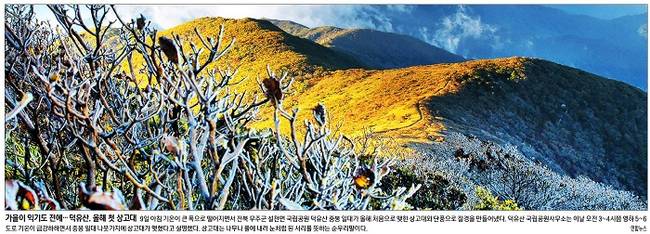가을이 익기도 전에 추위가 찾아왔다. 경향신문은 9일 아침 기온이 큰 폭으로 떨어지면서 전북 무주군 설천면 국립공원 덕유산 중봉 일대가 올해 처음으로 맺힌 상고대와 단풍으로 절경을 만들어낸 모습을 1면 사진으로 전했다. 경향신문은 “덕유산 국립공원 사무소는 이날 오전 3~4시쯤 영하 5~6도로 기온이 급강하하면서 중봉 일대 나뭇가지에 상고대가 맺혔다고 설명했다”며 “상고대는 나무나 풀에 내려 눈처럼 된 서리를 뜻하는 순우리말”이라고 보도했다.