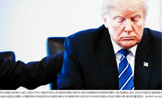 막말로 일어섰던 공화당 대선후보 도널드 트럼프가 11년 전 음담패설을 내뱉는 녹음파일이 공개되며 낙마 위기에 처했다. 중앙일보는 트럼프가 지난 7일(현지시간) 뉴욕 트럼프타워에서 열린 미 국경수비대협회와의 회의에 참석한 모습을 1면 사진으로 전했다. 중앙일보는 “워싱턴포스트가 지난 7일 보도한 녹음파일에 따르면 트럼프는 2005년 자신이 유부녀를 유혹하려 하고 여성의 은밀한 신체 부위까지 거론하는 상스러운 음담패설을 했다”며 “이로 인해 트럼프는 향후 미국 대선에서 후보 사퇴나 공화당의 대선후보 공식 거부라는 초유의 사태가 벌어질 가능성도 배제할 수 없게 됐다”고 보도했다.