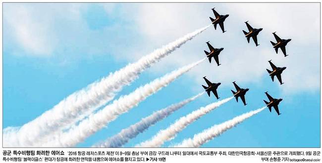 서울신문은 자사가 주관한 ‘2016 항공 레저스포츠 제전’ 사진을 1면을 통해 전했다. 서울신문은 “9일 공군 특수비행팀 ‘블랙이글스’ 편대가 창공에 화려한 연막을 내뿜으며 에어쇼를 펼치고 있다”며 “관람객들은 청명한 가을 하늘 아래 코스모스와 갈대가 어우러진 금강변에서 다양한 항공 레저스포츠 경기와 이벤트를 관람하고 체험했다”고 보도했다.