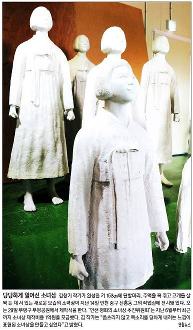 경향신문은 김창기 작가가 완성한 소녀상을 1면 사진에 담았다. 경향신문은 "키 153cm에 단발머리, 주먹을 꼭 쥐고 고개를 살짝 든 채 서 있는 새로운 모습의 소녀상이 김 작가의 작업실에 전시돼 있다"며 "'인천 평화의 소녀상 추진위원회'는 지난 6월부터 최근까지 소녀상 제작비용 1억원을 모금했다. 김 작가는 "움츠리지 않고 목소리를 당차게 내려는 느낌이 표현된 소녀상을 만들고 싶었다"고 밝혔다"고 전했다.