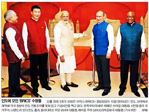 국민일보와 한국일보는 신흥 경제 5개국 모임인 브릭스(BRICS) 정상회담 장면을 1면에 게재했다.