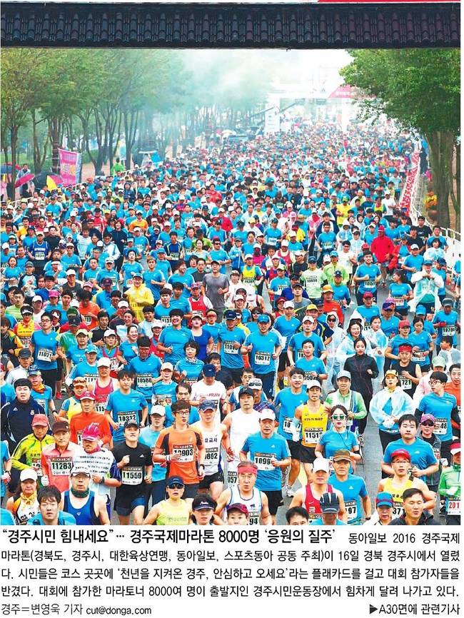 동아일보는 경주국제마라톤 참가자들이 달려 나가고 있는 모습을 1면에 실었다. 동아일보는 "'천년 고도' 경주에 생동감이 넘쳤다. 출발을 앞두고 가을비가 내렸지만 8000여 명의 건각들이 펼치는 레이스에는 아무 문제가 되지 않았다"며 "힘차게 내딛는 한 발 한 발은 땅을 다스리는 신령을 달래어 무사함을 기원하는 지신밟기와 다를 게 없었다"고 했다.