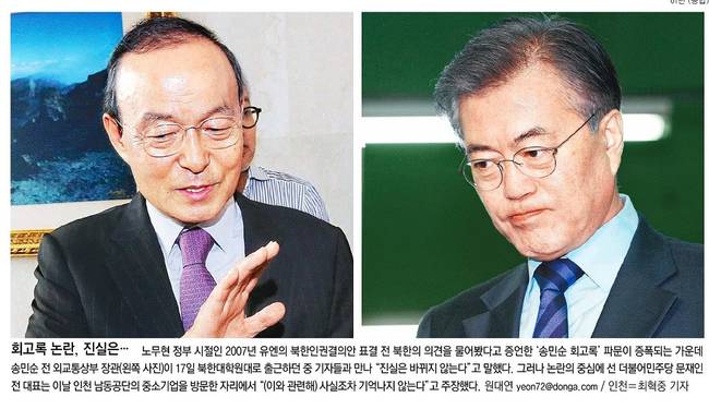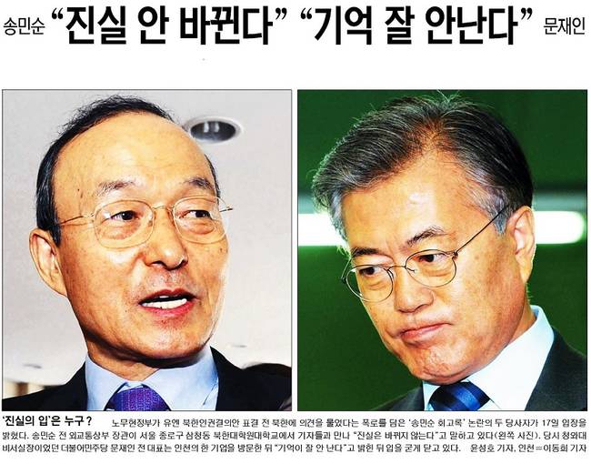 송민순 전 외교통상부 장관의 회고록을 둘러싼 진실 공방이 벌어지고 있다. 2007년 정부의 유엔 북한인권결의안 기권 결정에 앞서 당시 비서실장인 문재인 더불어민주당 전 대표가 북한에 의견을 묻자고 했다고 송 전 장관이 주장했다. 문 전 대표는 "기억이 나지 않는다"고 밝혔다.
