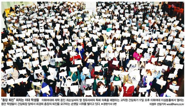 한겨레는 총장 퇴진을 외치는 이화여대 학생들의 모습을 1면에 담았다. 한겨레는 "이화여대가 최순실씨의 딸 정유라씨를 둘러싼 입학·학점 특혜 의혹을 조사하기 위해 특별조사위원회를 꾸리기로 했다"며 "송덕수 이화여대 부총장은 "입시는 아주 엄정하게 진행됐고, 전혀 문제가 없었다"며 특조위 조사 결과가 정씨에게 소급적용되진 않는다고 설명했다. 이대 학생 1100여명은 질의응답 행사장 앞에서 시위를 벌였다"고 전했다.