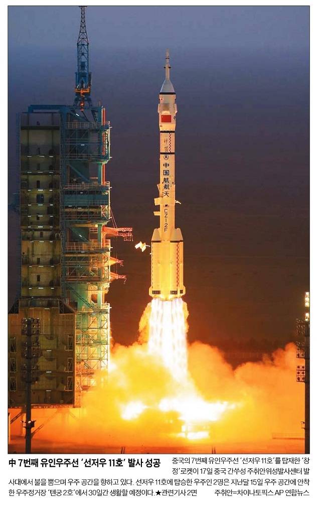 한국일보는 중국의 7번째 유인우주선인 '선저우 11호'를 탑재한 '창정' 로켓이 발사하는 모습을 1면에 실었다. 한국일보는 "중국이 2022년 완성 예정인 유인 우주정거장 건설에 한 걸음 더 다가섰다"며 "미국ㆍ러시아에 버금가는 신흥 우주강국으로서의 위상을 과시한 중국의 ‘우주굴기’는 앞으로 더욱 가속화할 전망"이라고 했다.