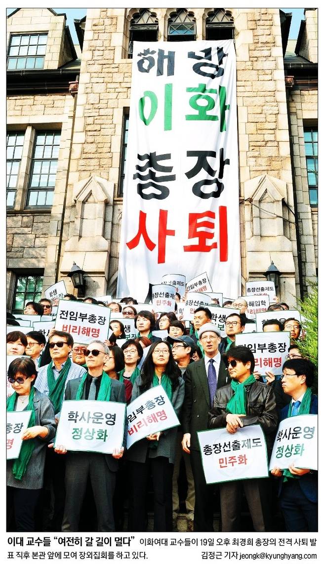 20일 경향신문과 중앙일보는 이화여대 교수들이 최 총장의 사퇴 발표 후 장외집회를 하고 있는 모습, 이화여대 학생들이 집회를 마친 뒤 행진하는 모습을 각각 1면에 실었다.