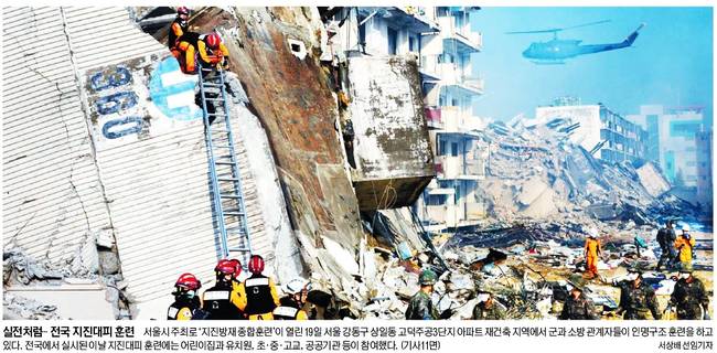 세계일보는 "민방위의 날을 맞아 이날 전국에서 실시된 지진대피훈련 가운데 서울시의 훈련은 최대 규모로 진행됐다"며 "훈련은 서울을 지나는 남북단층 선상의 한 곳인 경기도 광주시 남한산성 인근에서 규모 6.8의 지진이 발생했을 때의 시뮬레이션 결과를 바탕으로 피해 상황이 설정됐다"고 보도했다.