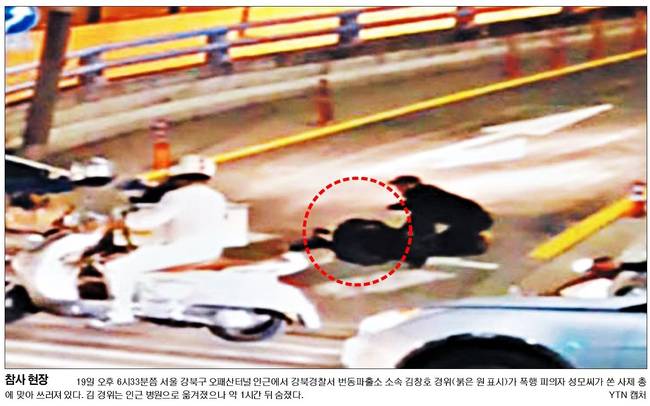 국민일보와 조선일보는 서울 강북구 번동 오패산 터널 인근에서 벌어진 총격 사건 현장 사진을 1면에 담았다.