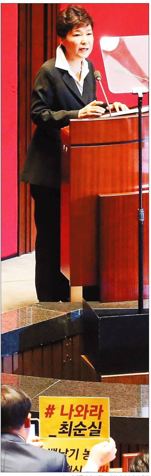 한국일보는 ‘박 대통령 앞 피켓 시위’라는 제목이 달린 사진을 1면으로 보도했다. 한국에 따르면 박 대통령이 국회 본회의장에서 내년도 예산안 관련 시정연설을 하는 가운데 무소속 김종훈 의원이 ‘나와라 최순실’ ‘백남기 농민 부검 대신 사과’ 문구가 적힌 피켓을 들었다.