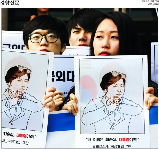 박근혜 정부 문화계 황태자로 불리는 차은택씨가 CF감독으로 활동할 당시 은인이었던 송성각씨를 문화체육관광부 장관에 앉히려고 이력서까지 받았다는 증언이 나왔다. 박근혜 대통령이 28일 청와대 수석비서관 전원에게 일괄사표 제출을 지시했고, '청와대 문고리 3인방'으로 불리는 정호성 부속비서관, 이재만 총무비서관, 안봉근 국정홍보비서관도 함께 사표를 제출한 것으로 알려졌다. 경향신문과 국민일보, 동아일보, 서울신문, 세계일보, 조선일보, 중앙일보, 한겨레, 한국일보 등 대다수 조간신문은 29일 최순실 게이트와 관련된 소식을 1면에 담았다.