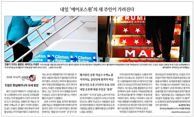 경향신문은 이날 미국 대선을 이틀 앞둔 6일(현지시간) 힐러리 클린턴 민주당 대선후보가 펜실페니아주 필라델피아국제공항에서 전용기에 탑승하고 있는 장면과 도널드 트럼프 공화당 후보가 같은 날 펜실베니아주 문타운십 유세를 하기 위해 전용기에서 내리는 모습을 실었다.