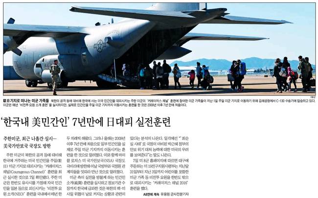 미군은 매년 '비전투 요원 소개 훈련'을 실시하지만, 실제로 민간인을 주일 미군 기지까지 이동시키는 훈련을 한 것은 2009년 이후 7년 만에 처음이라고 조선일보는 분석했다.