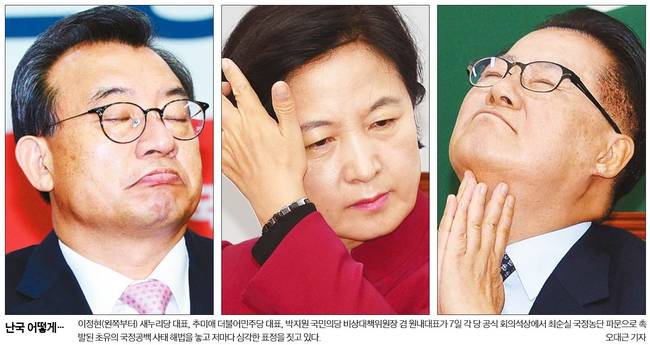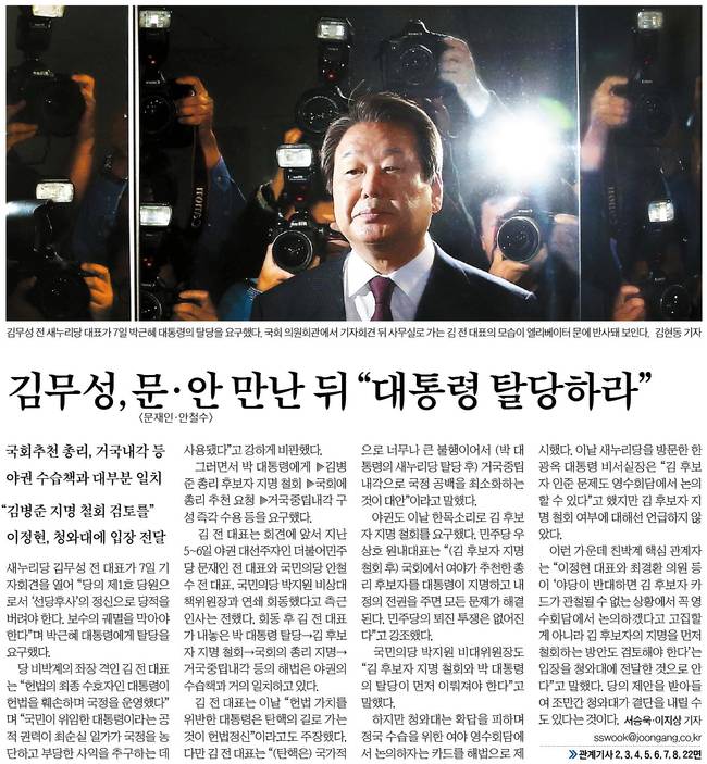주요 신문들은 8일자 1면 사진기사로 박근혜 대통령 퇴진을 요구하는 학계와 정치권의 목소리 등을 주요하게 다뤘다.
