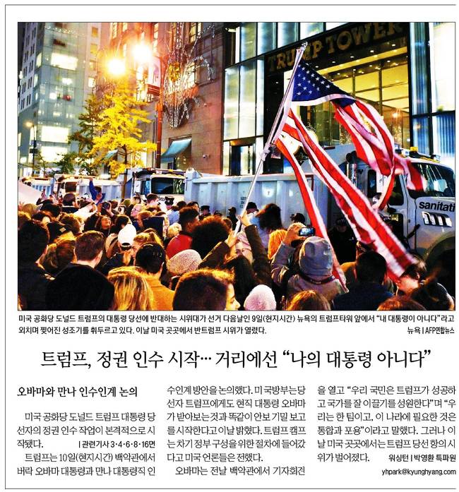 경향신문은 미국 공화당 도널드 트럼프의 대통령 당선에 반대하는 시위대가 선거 다음날인 9일(현지시간) 뉴욕의 트럼프타워 앞에서 "내 대통령이 아니다"라고 외치며 찢어진 성조기를 휘두르고 있는 장면을 담았다.
