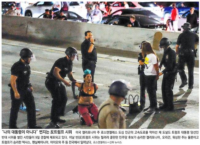 동아일보는 미국 캘리포니아 주 로스앤젤레스 도심 인근의 고속도로를 막아선 채 도널드 트럼프 대통령 당선인 반대 시위를 벌인 시민들이 9일 경찰에 체포되고 있는 장면을 실었다.