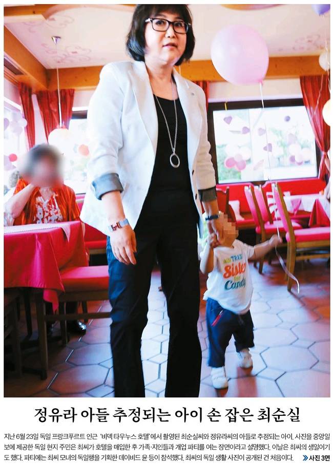 중앙일보는 지난 6월23일 독일 프랑크푸르트 인근 '비덱 타우노스 호텔'에서 촬영된 최순실씨와 정유라씨의 아들로 추정되는 아이의 모습을 실었다.