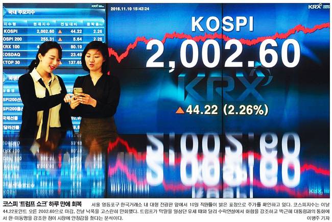 서울신문도 미 대선 쇼트에 폭락했던 코스피지수가 10일 전날보다 44.22포인트 오른 2002.60에 거래를 마치며 반등하자 서울 명동 KEB하나은행 딜러들이 환하게 웃고 있는 모습을 담았다.