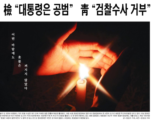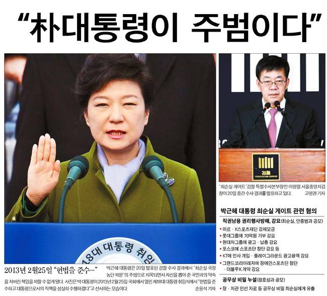 국민일보는 "검찰이 20일 박근혜 대통령을 최순실 사태의 ‘공범’이자 ‘피의자’로 공식 지목하자 청와대가 검찰 조사 요구를 거부하고 ‘차라리 대통령을 탄핵하라’고 정치권에 요구했다"며 "헌정 68년 사상 현직 대통령으로서는 처음 검찰에 의해 피의자로 지목된 박 대통령은 검찰 조사 수용 대신 특검과 탄핵 등 극단적인 길을 선택했다"고 보도했다.