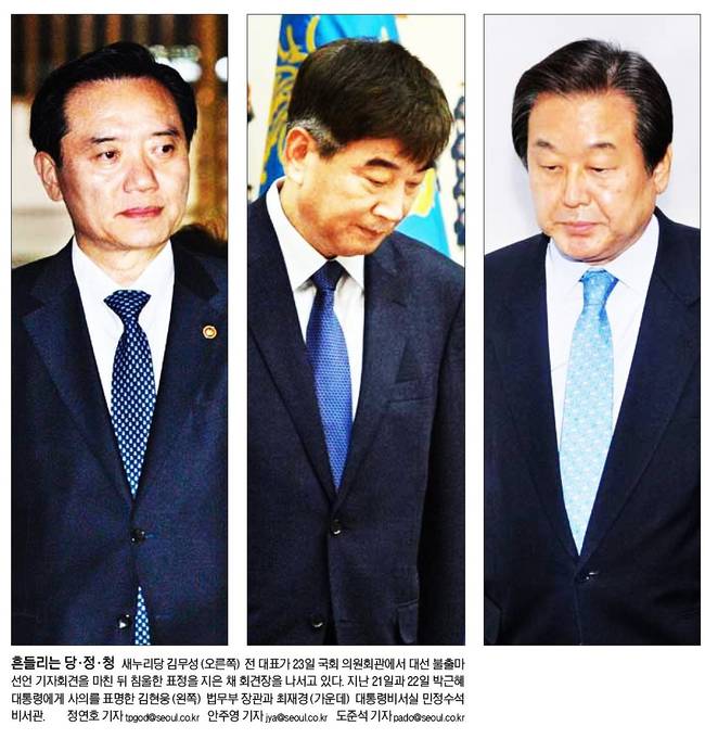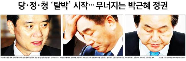한국일보는 ""(김 장관과 최 수석의 사의 표명으로) 청와대와 정부, 여당은 충격에 휩싸였다. 또 김무성 새누리당 전 대표가 박 대통령 탄핵을 주도하겠다고 나서면서 정권의 3각 축인 당ㆍ정ㆍ청이 모두 사납게 흔들리고 있다"며 "박 대통령의 ‘결단’을 요구하는 극심한 국정 위기 상황이 전개되고 있지만, 청와대와 정부, 새누리당 친박계는 껍데기만 남은 권력을 부여잡은 채 버티고 있다"고 보도했다.