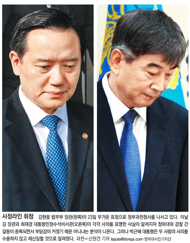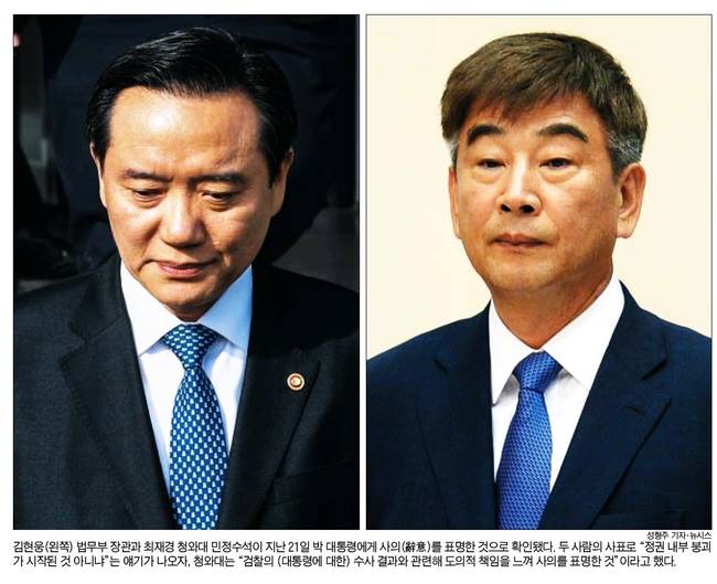김현웅 법무부 장관과 최재경 청와대 민정수석이 사의를 표명한 사실이 23일 밝혀졌다. 김 장관은 20일 검찰의 최순실 게이트 중간 수사 발표(20일) 직후인 21일, 최 수석은 22일 민정수석으로 임명된 지 20여일만에 사표를 제출했다.