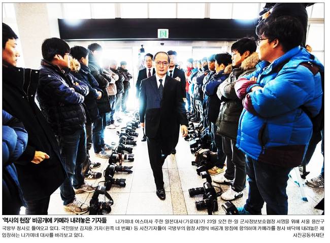 국민일보는 한일 군사정보보보협정 밀실 서명에 반발해 카메라를 내려 놓은 사진기자들의 모습을 1면에 실었다.