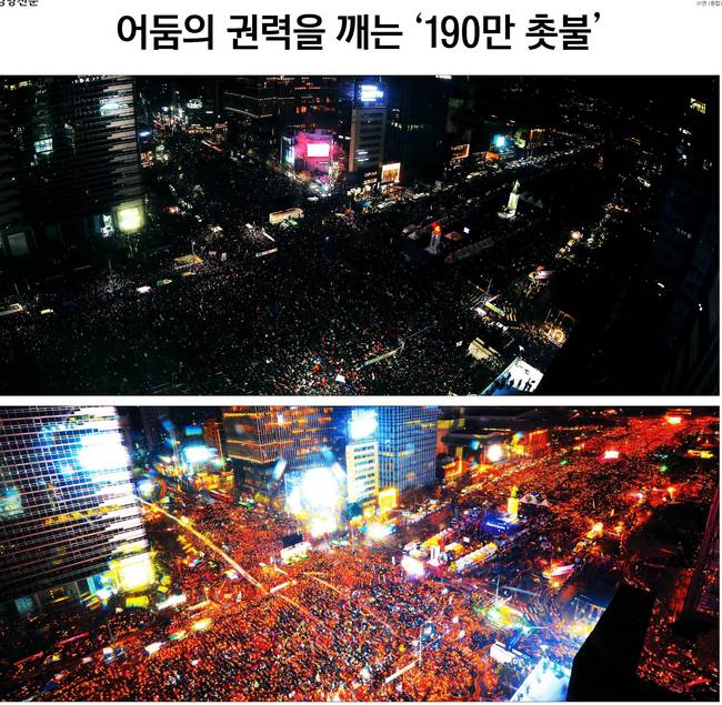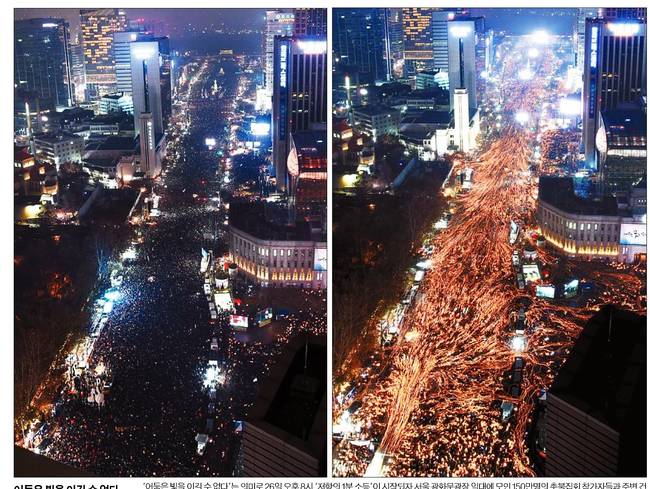 서울신문은 ‘첫눈 비바람도 촛불 된 날...어둠은 빛을 이길 수 없다’는 제목의 1면 사진 설명을 통해 “150만 시민들이 들고 나온 촛불과 서울신문을 비롯한 건물의 불빛이 사라졌다. 이후 일제히 켜진 불은 그 어느 때보다 밝게 빛났다”고 설명했다.