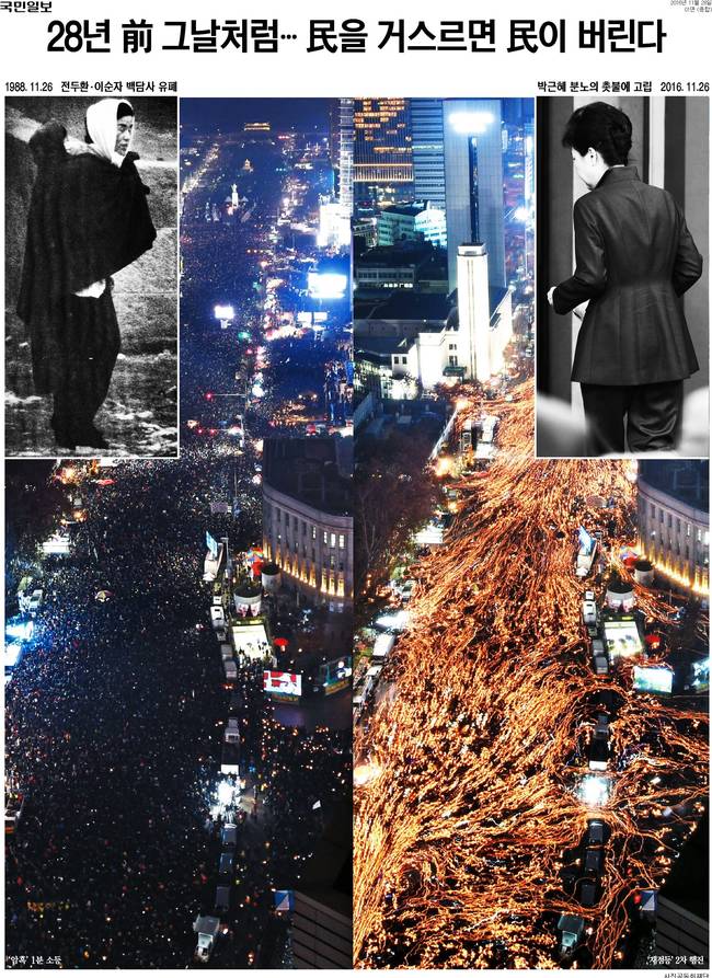 국민일보는 28년전 전두환 전 대통령의 부인 이순자씨가 강원도 인제군 백담사 경내를 서성이는 장면과 함께 현재의 촛불 시위, 박 대통령의 모습을 한꺼번에 1면에 담았다. 국민에 따르면 당시 사진기자는 혹한과 폭설을 뚫고 백담사 부근으로 올라가 잠복근무 끝에 사진 촬영에 성공했다. 국민은 이날 ‘民을 거스르면 民이 버린다’는 호외를 만들어 서울시내에 뿌렸다.