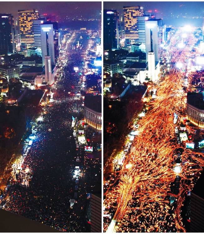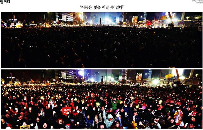 서울 광화문 일대에서 150만개의 촛불이 1분간 꺼졌다. 칠흑 같은 어둠 속에 ‘박근혜는 퇴진하라’는 함성이 이어졌다. 촛불은 광화문에서 남대문까지, 옆으로는 종로, 청계천로, 새문안길, 율곡로까지 메워졌다”고 밝혔다.