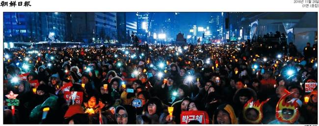 조선일보는 촛불과 관련 외신들의 평가를 1면 사진에 담았다. 조선은 “지난 26일 서울 광화문 광장이 박 대통령의 퇴진을 요구하는 시민들이 든 촛불로 빛나고 있다. 외신들은 서울에 역대 최대 규모의 시위 인파가 모인 이날 집회가 유례를 찾기 어려운 평화시위라며 집중 보도했다”고 보도했다. 조선에 따르면 미국 뉴욕타임즈는 “수많은 사람이 서울 중심가를 메웠지만 매우 평화로웠고 축제 같았다”고 보도했다.