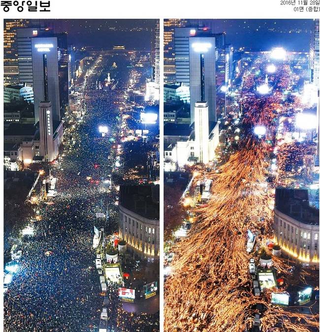 중앙일보는 “26일까지 다섯 차례에 걸쳐 토요일마다 열린 촛불집회에 참여한 연인원은 서울 333만 명, 지방 76만 명이다. ‘박근혜 정권퇴진 비상국민행동’이 추산한 수치다. 전국적으로 400만 명 이상이 참가했다는 의미”라며 “집회의 양상은 새롭다. 경찰과의 물리적 충돌이 거의 없고, 과격한 행동으로 연행되는 이도 드물다”고 보도했다.