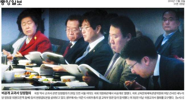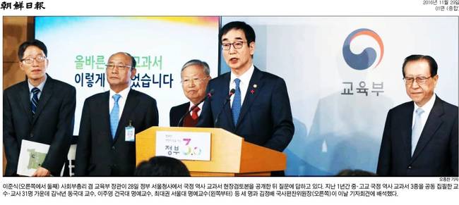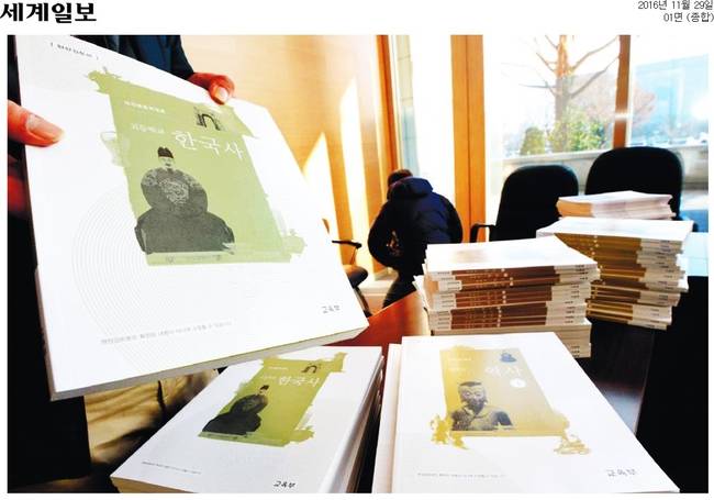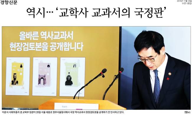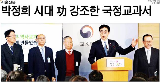 박근혜 정부의 대표 정책인 ‘국정 역사 교과서’가 28일 공개됐다. 교육부와 국사편찬위원회는 “균형 있는 역사관과 올바른 국가관을 가질 수 있는 교과서”라고 강조했지만, 박정희 정권과 재벌을 미화했다는 지적이 끊이질 않고 있다. 29일 경향신문과 동아일보, 서울신문, 세계일보, 조선일보, 중앙일보, 한국일보 등 대다수 조간신문은 국정 교과서의 공개 소식을 1면에 담았다.