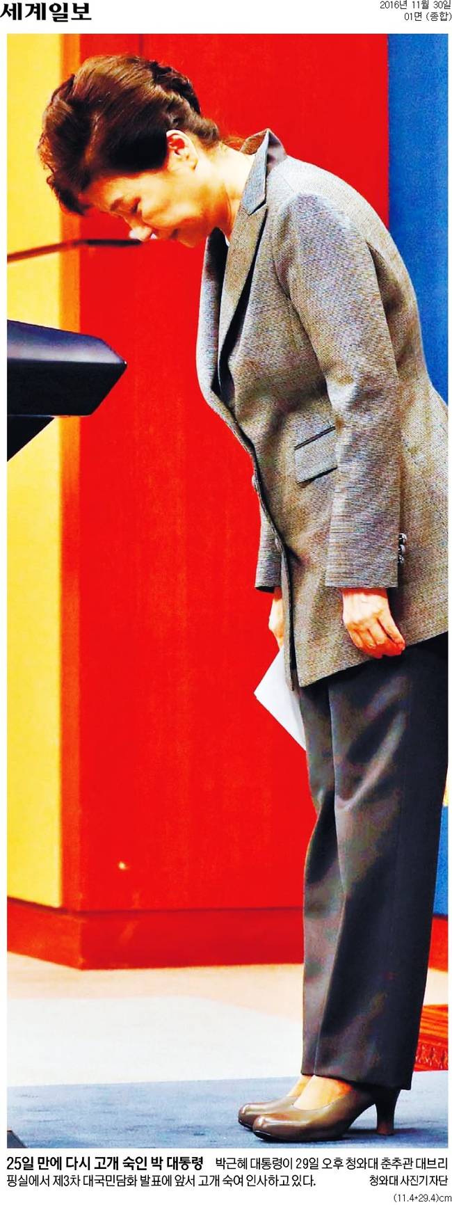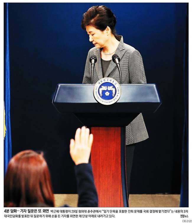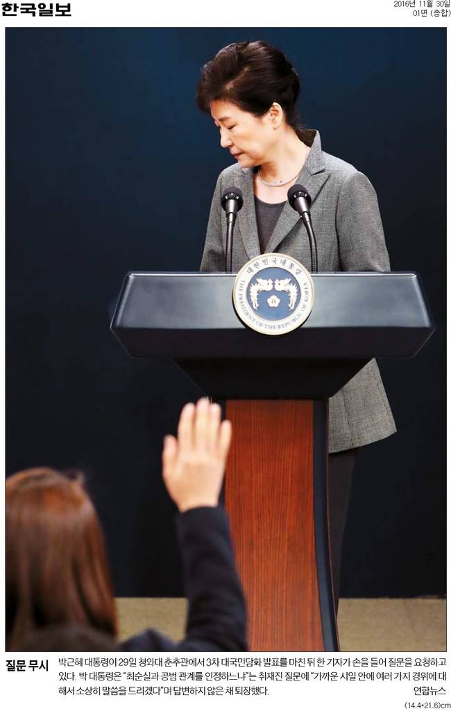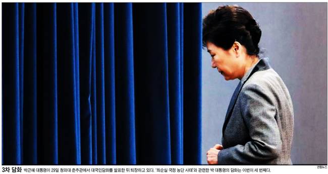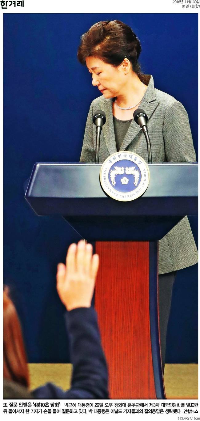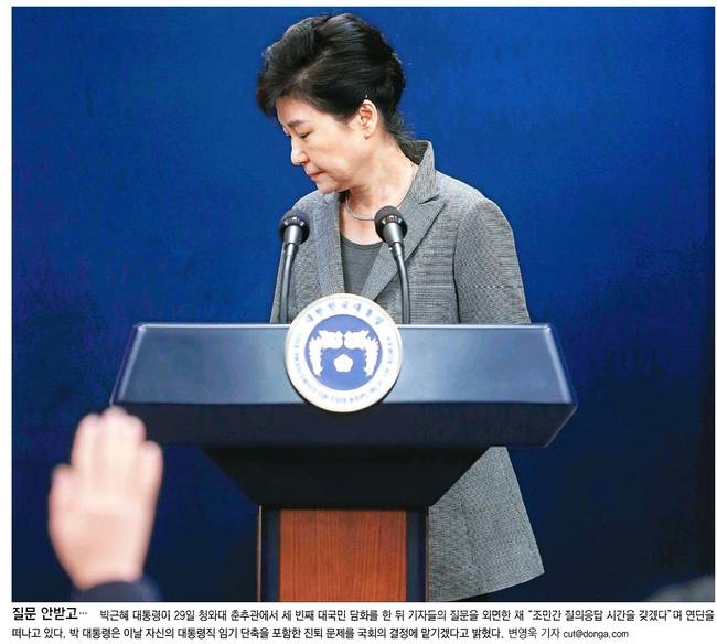 박근혜 대통령은 29일 “대통령직 임기 단축을 포함한 진퇴 문제를 국회의 결정에 맡기겠다”고 밝혔다. 30일 경향신문과 국민일보, 동아일보, 서울신문, 세계일보, 조선일보, 중앙일보, 한겨레, 한국일보 등 대다수 조간신문은 박 대통령의 대국민담화 소식을 1면 사진에 담았다.